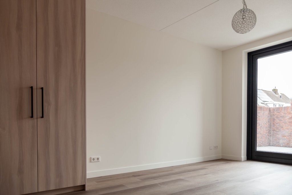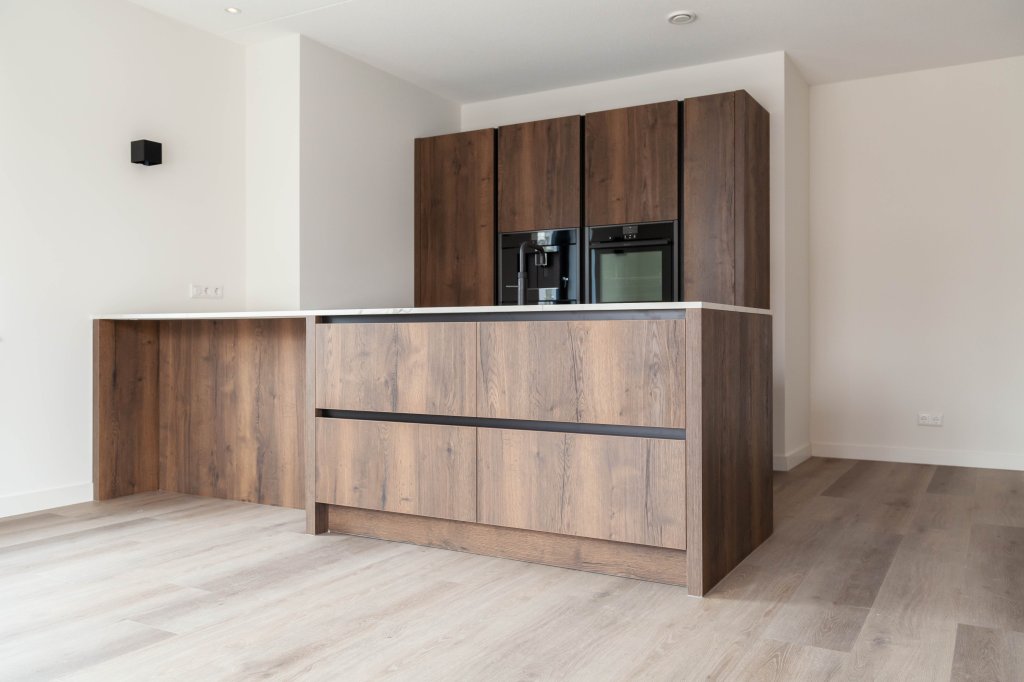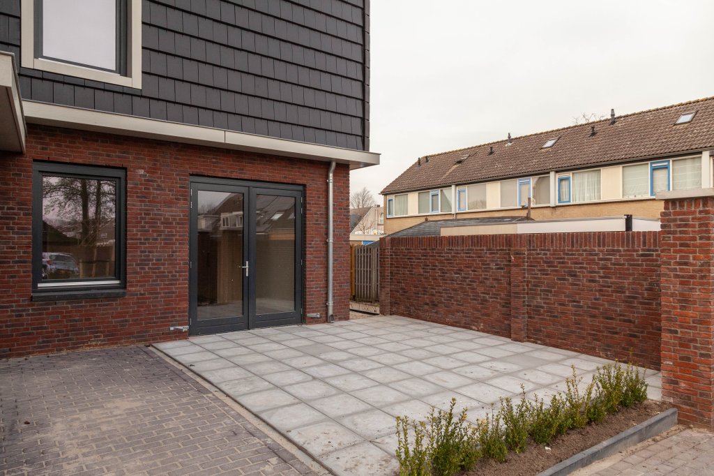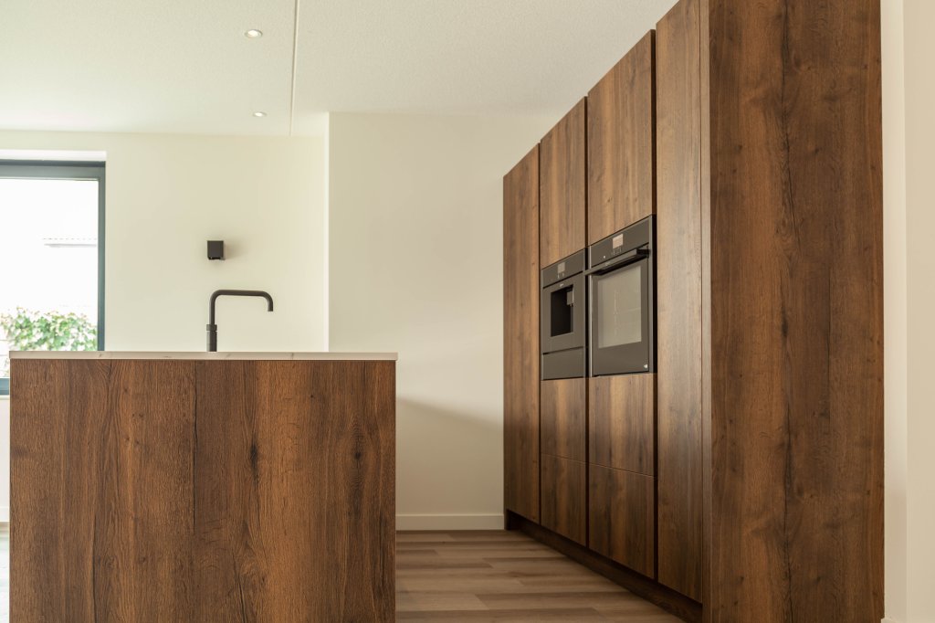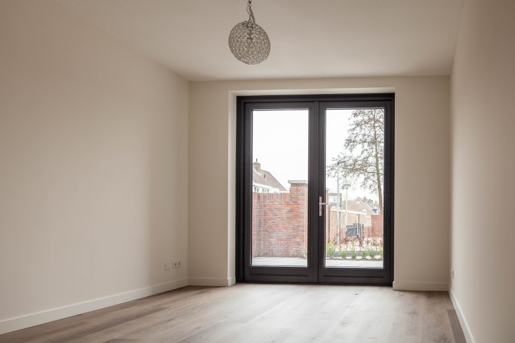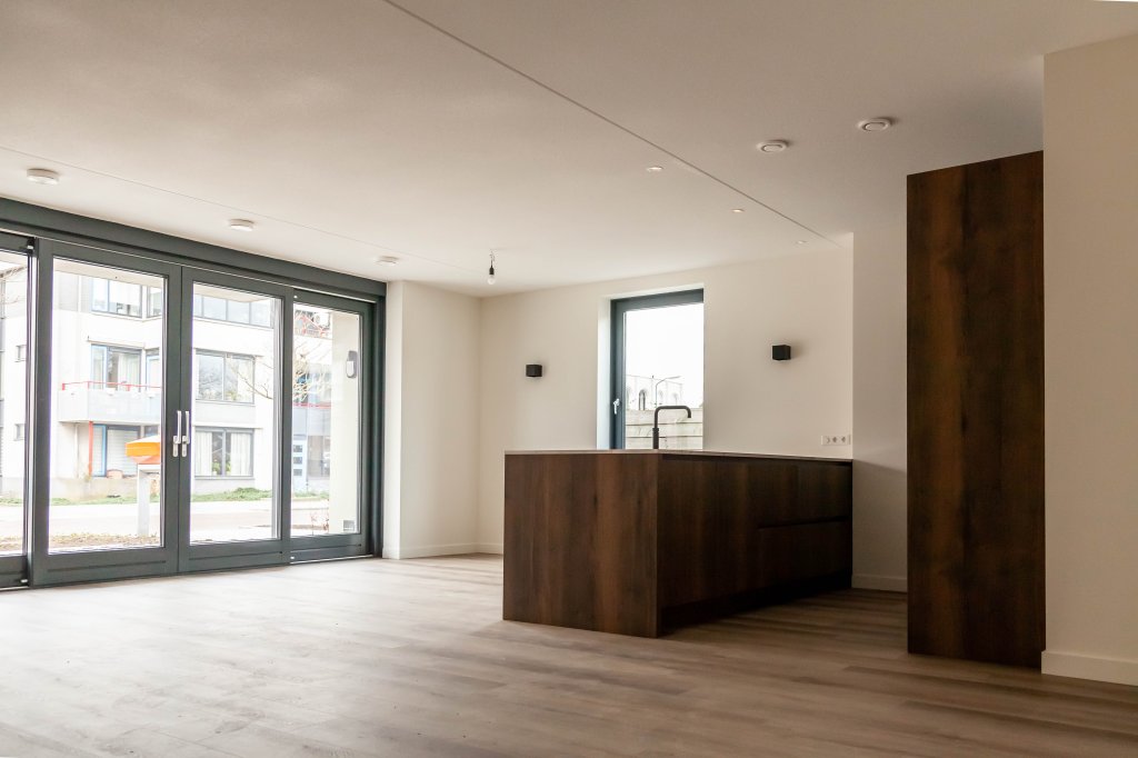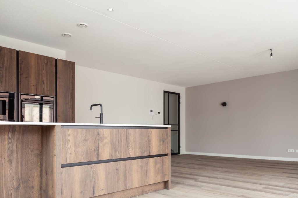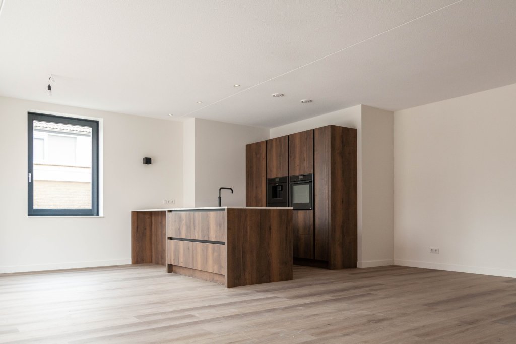 Through the entrance you reach the hall with built-in wardrobe, which gives you access to the toilet room with wall closet and fountain, technical room where the heat pump, washing machine and dryer connections are located, 2 bedrooms and the living room / kitchen. The spacious living room with open kitchen is located at the front of the house and has French doors, so you can reach the garden. The kitchen is luxuriously furnished with a cooking island and various luxury built-in appliances. Such as a built-in coffee machine, combi oven and induction hob with built-in extraction. The bathroom is adjacent to the master bedroom and has a walk-in shower, toilet and a double sink.