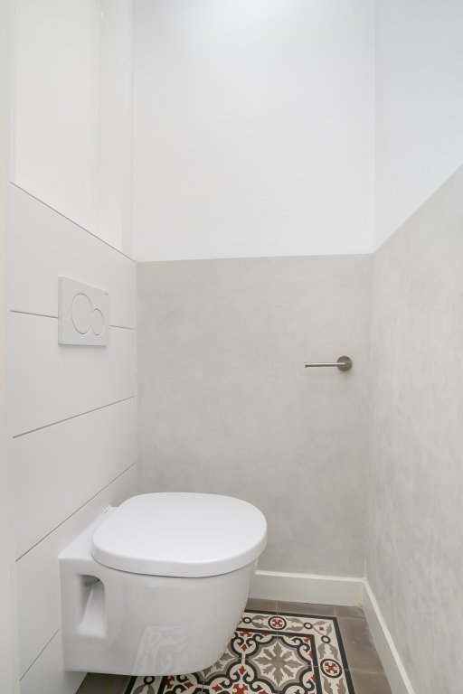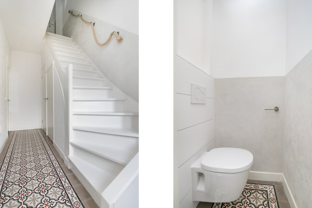 Hall with meter cupboard, storage cupboard, toilet and access to the living room. both the hall and the toilet have a Portuguese floor tile with a playful motif.