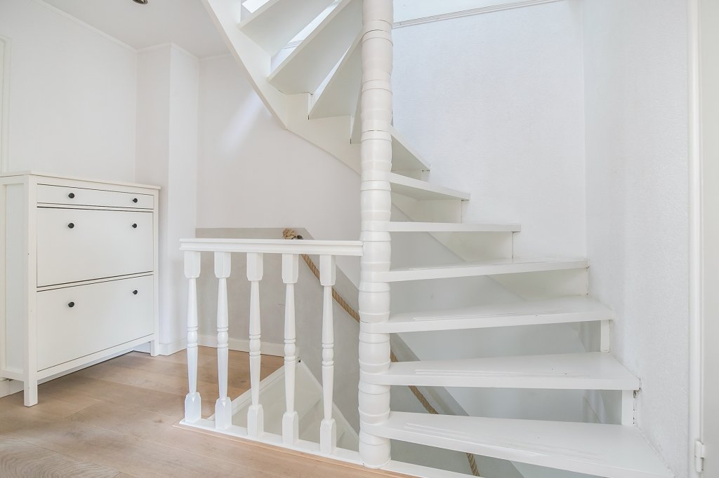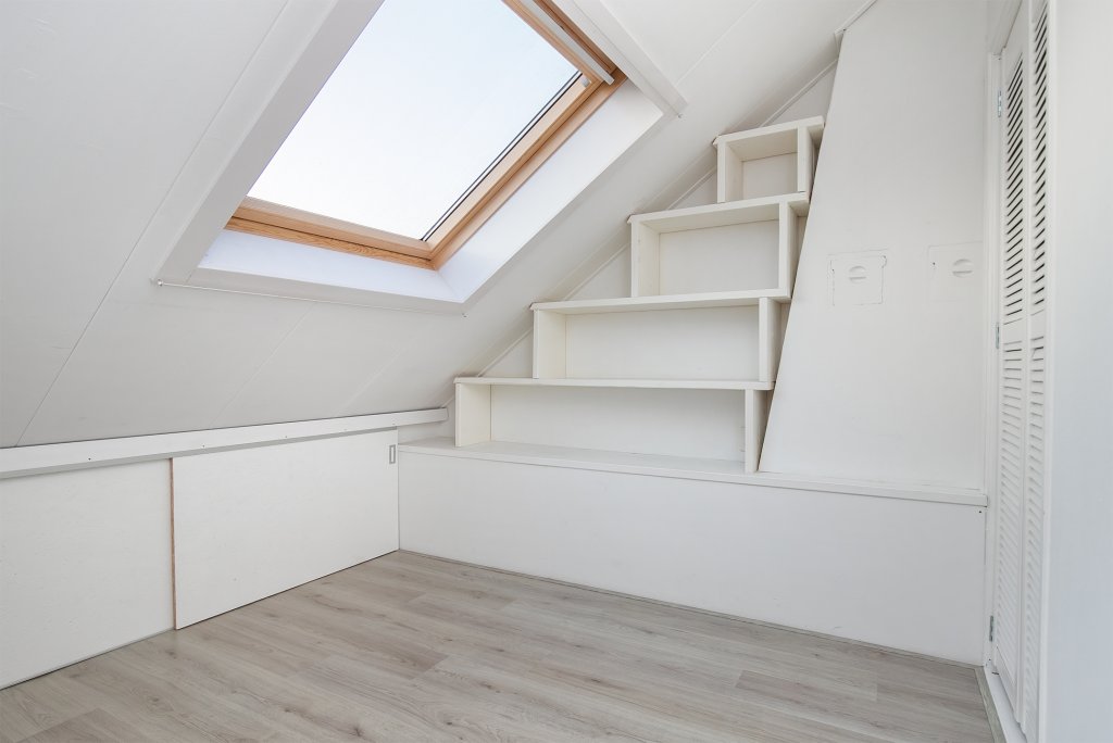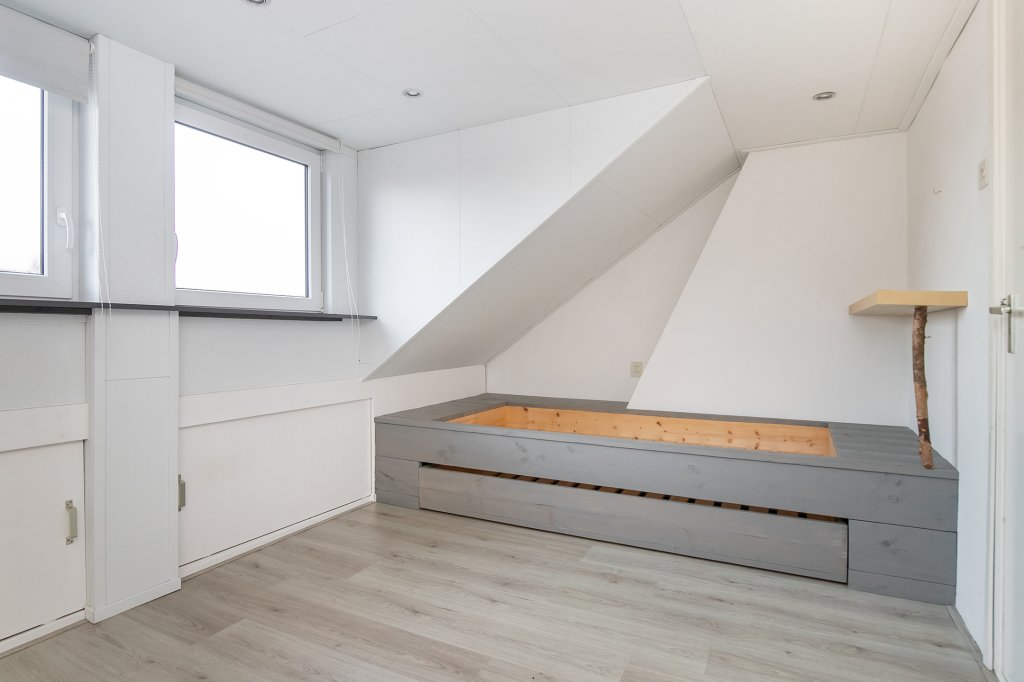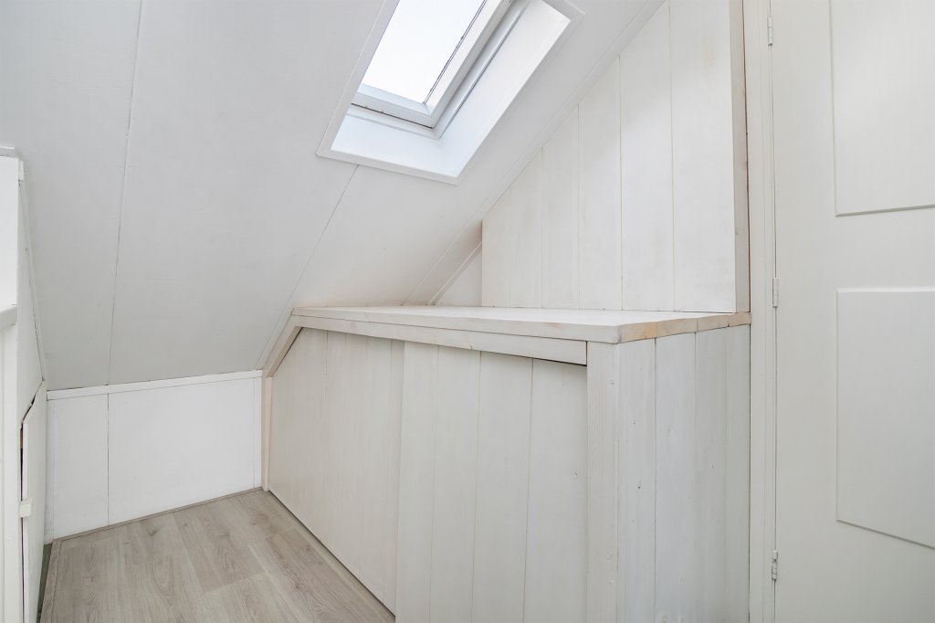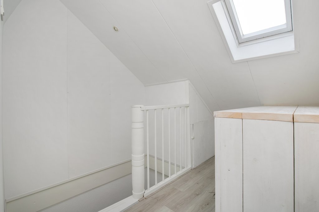 Landing with connection point for washing machine and dryer and access to 2 bedrooms under the sloping roof. The built-in bed in the largest room at the rear of the house will remain behind when the house is rented out.