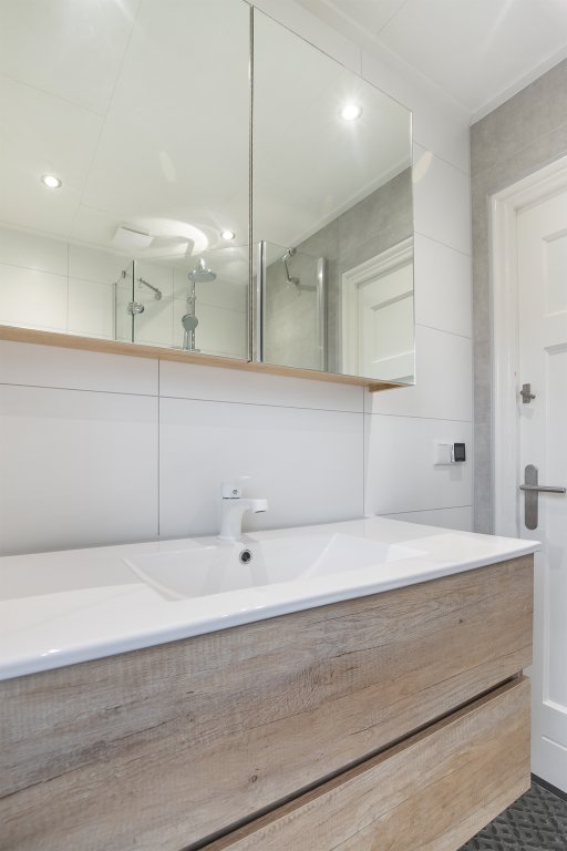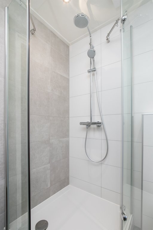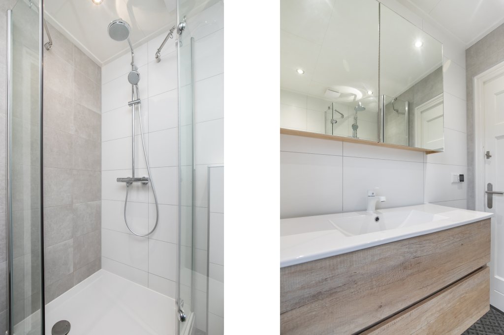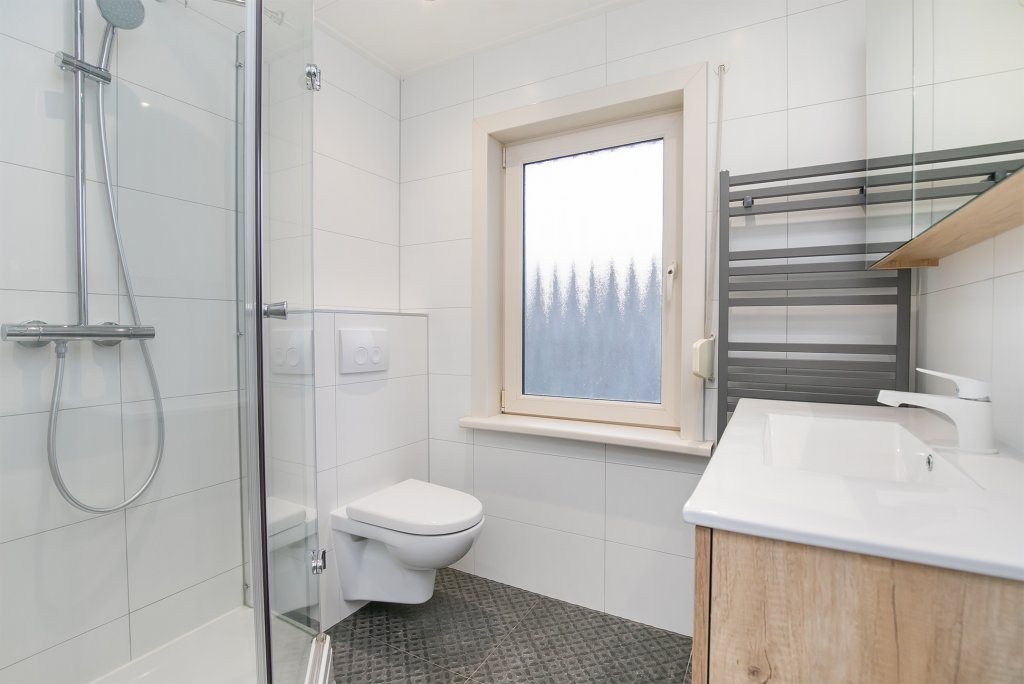 2 spacious bedrooms and a bathroom. The bathroom has a walk-in shower, toilet, washbasin and design radiator.