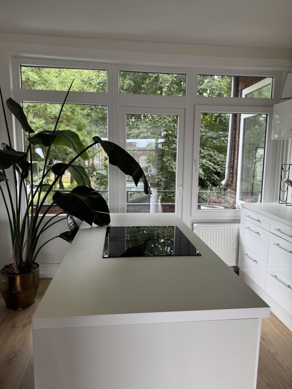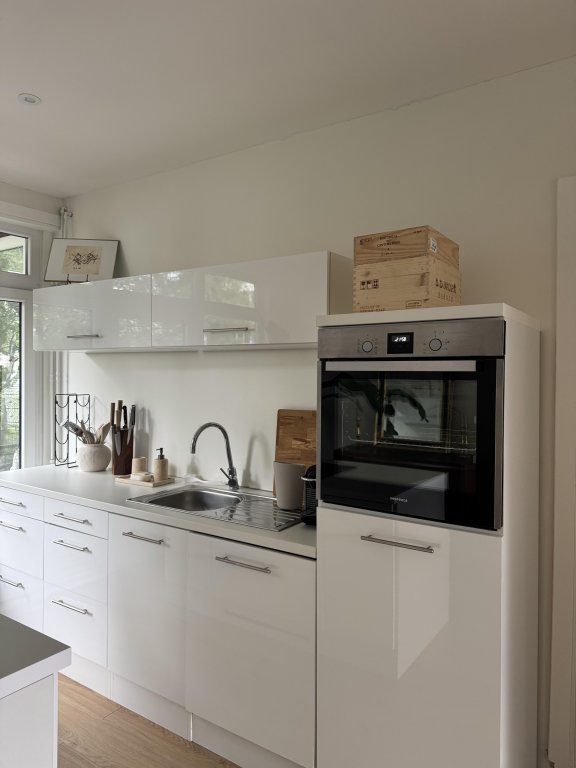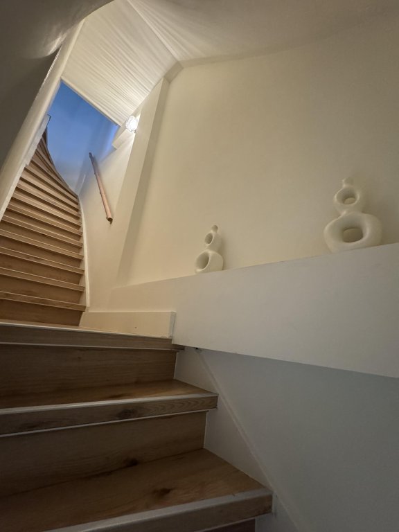 Via the staircase you reach the entrance of the apartment. The hallway provides access to the bright living room with an open kitchen, which is equipped with various built-in appliances including an oven, refrigerator, dishwasher, and an induction hob with integrated extractor.