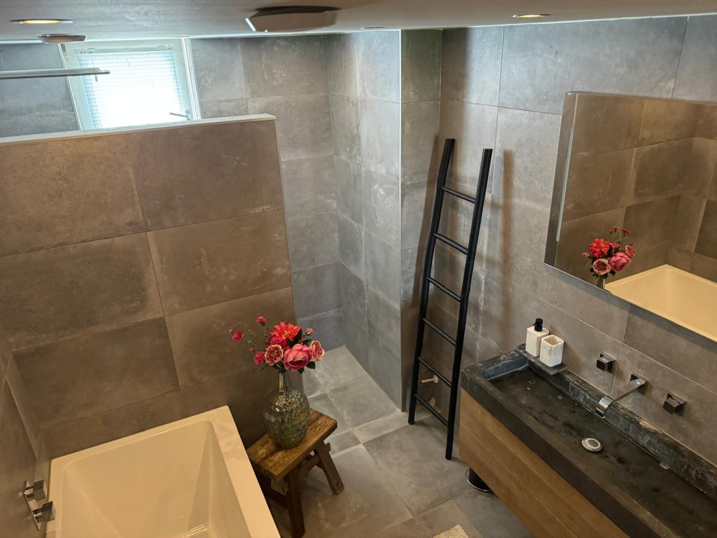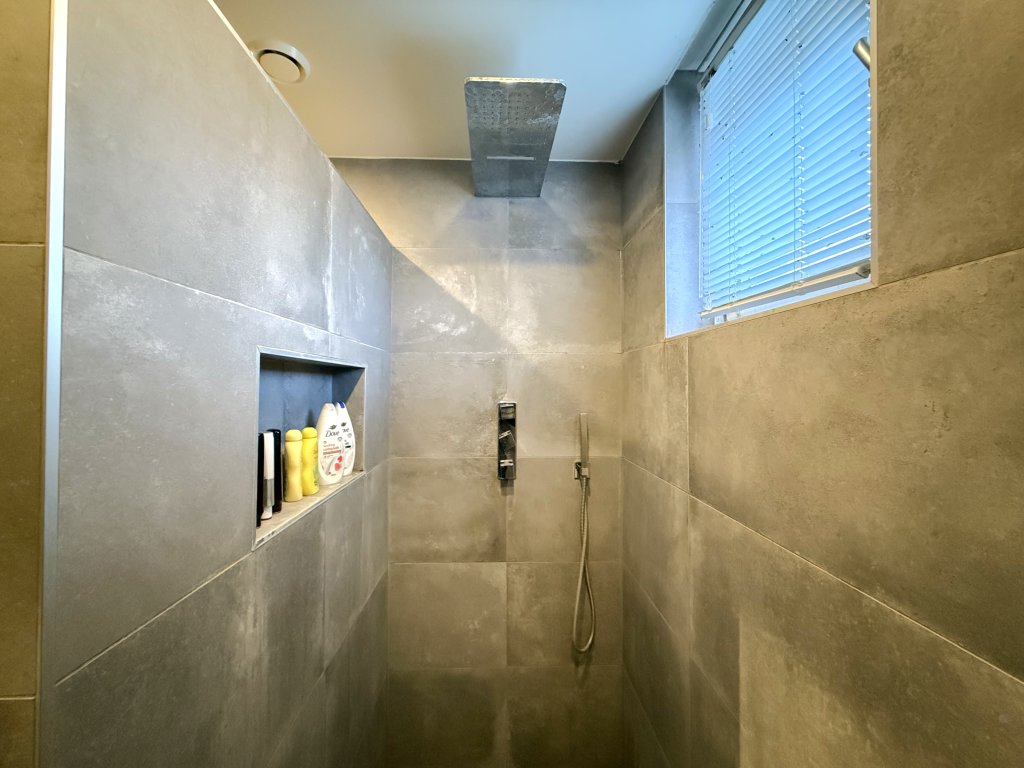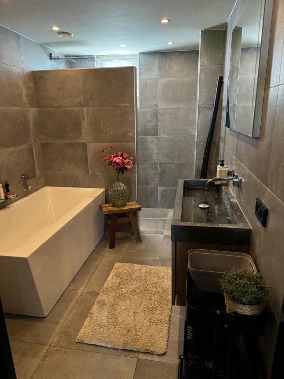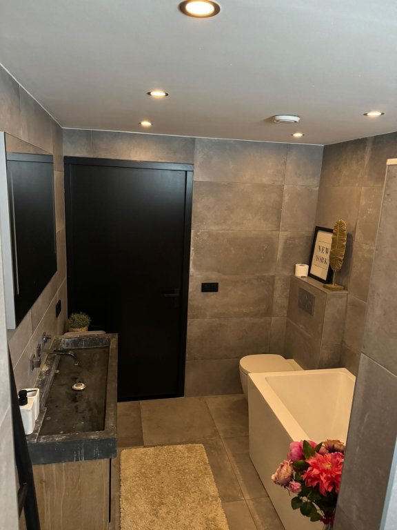 Spacious entrance with large built-in storage space, followed by the entrance to the open kitchen with cooking island, equipped with built-in appliances (refrigerator, dishwasher, combination microwave and gas hob). Modern living room with patio doors to the backyard. The living area has a U-shaped sofa with surround set for the ultimate cinema experience. Would you rather watch TV at the kitchen table? Then this is possible by turning the second TV out of the wall! From the living room you enter the hall with toilet with wall-mounted toilet and fountain and a beautifully upholstered staircase.