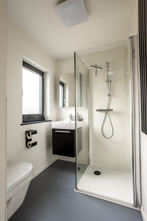 The bedroom features a double bed and large wardrobe. The bathroom is modern and fitted with a walk-in shower, washbasin with cabinet, and toilet.