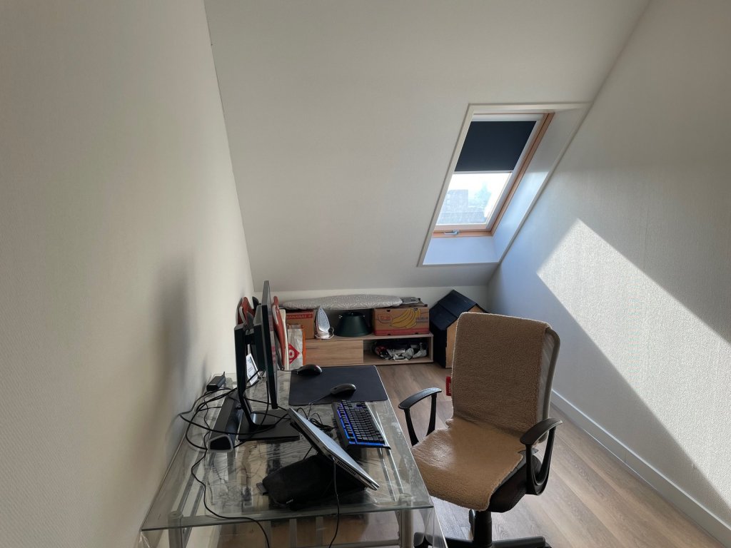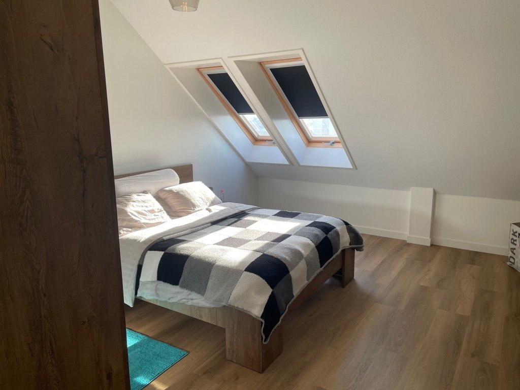 The apartment has two bedrooms, including a spacious master bedroom with two Velux windows. The bathroom is fully tiled and equipped with a walk-in shower and a wide sink. A major plus is the separate toilet.