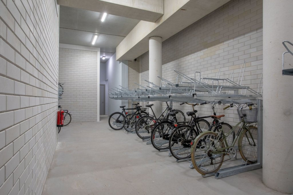 The complex offers a shared bicycle storage and a private parking space within walking distance.