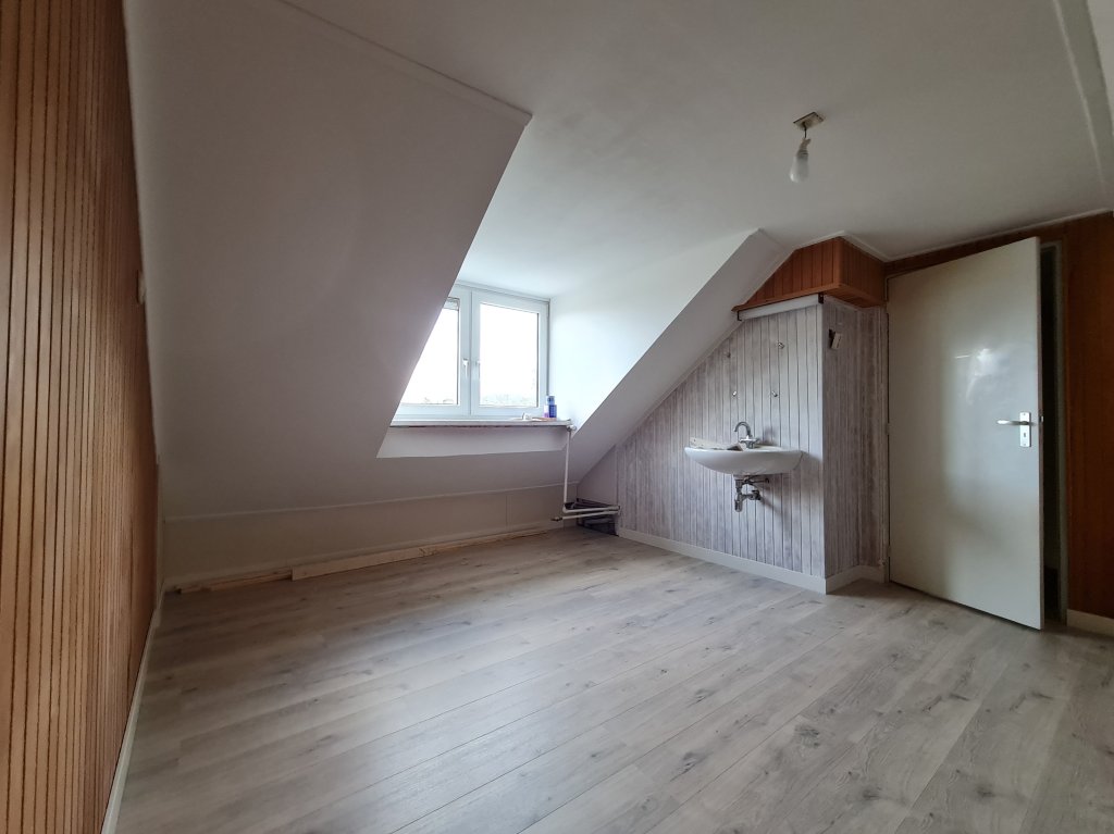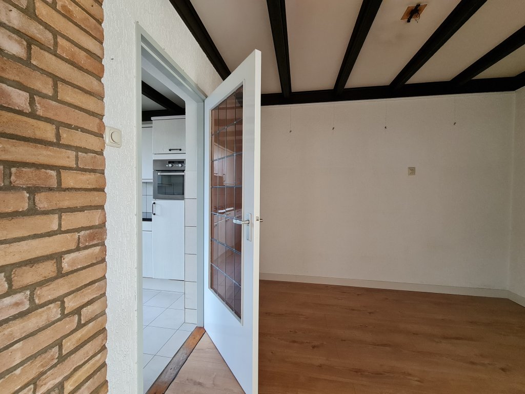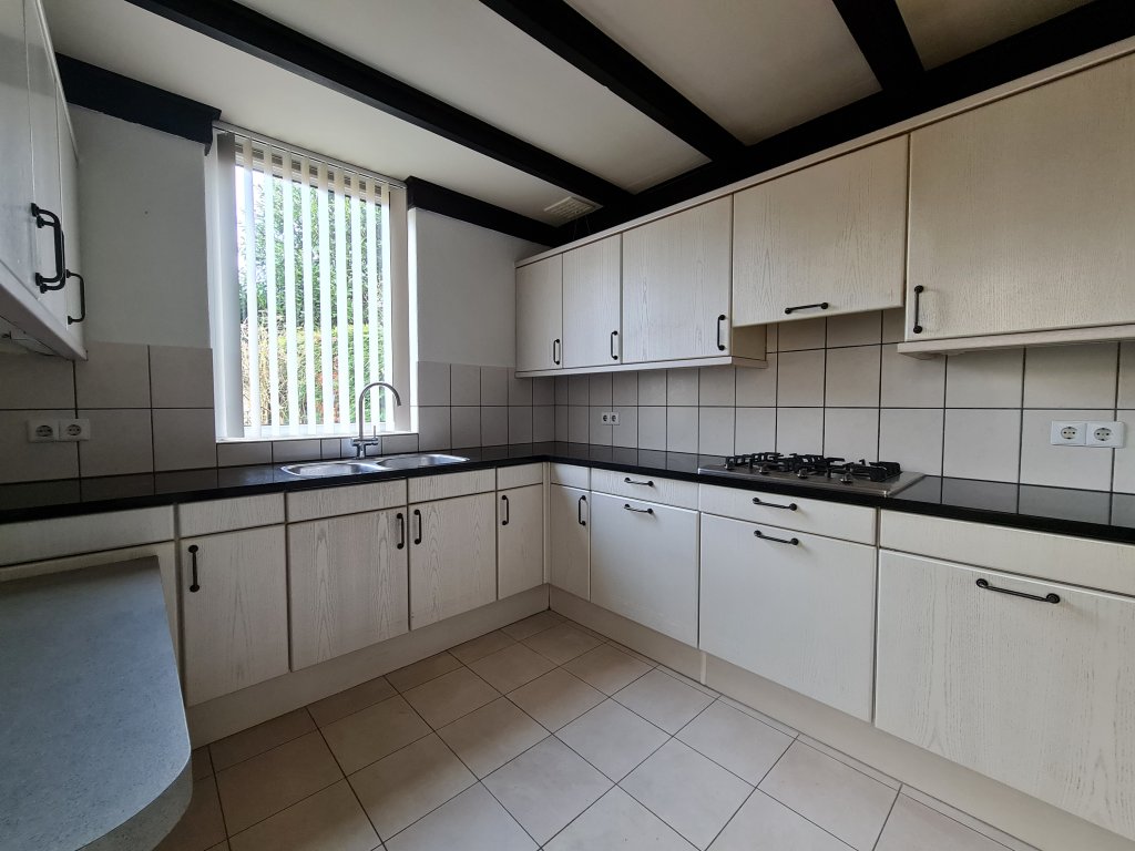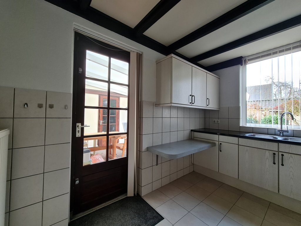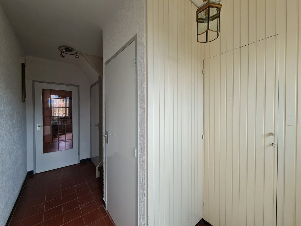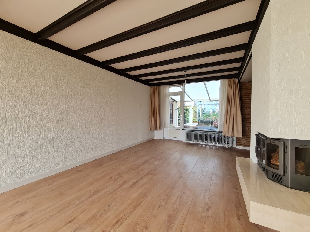 Hall with meter cupboard, cloakroom, toilet room with fountain and then the spacious L-shaped living room with gas fireplace and extension containing the kitchen. Equipped with a neat U-position with hob, oven and refrigerator. The covered terrace and garden are accessible from the kitchen.