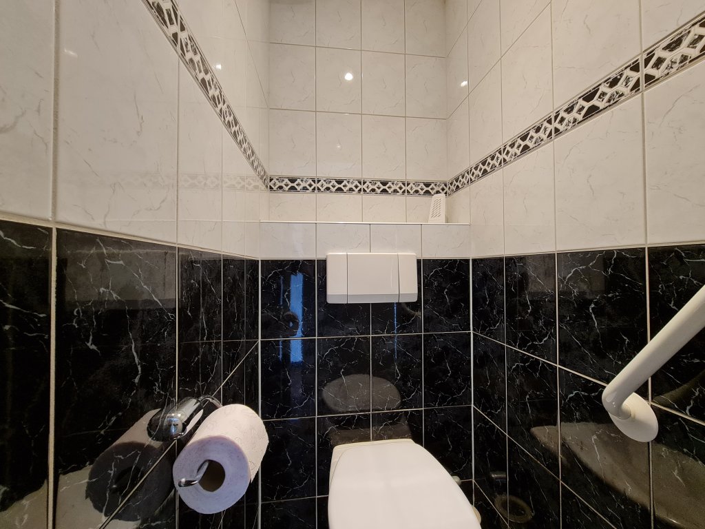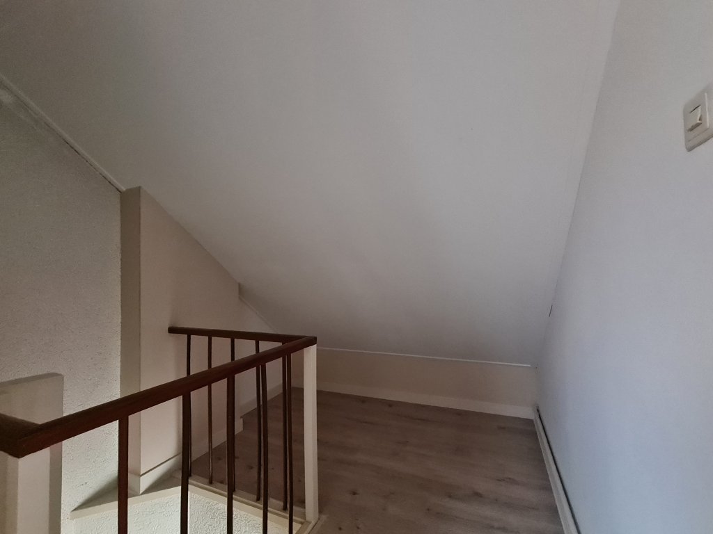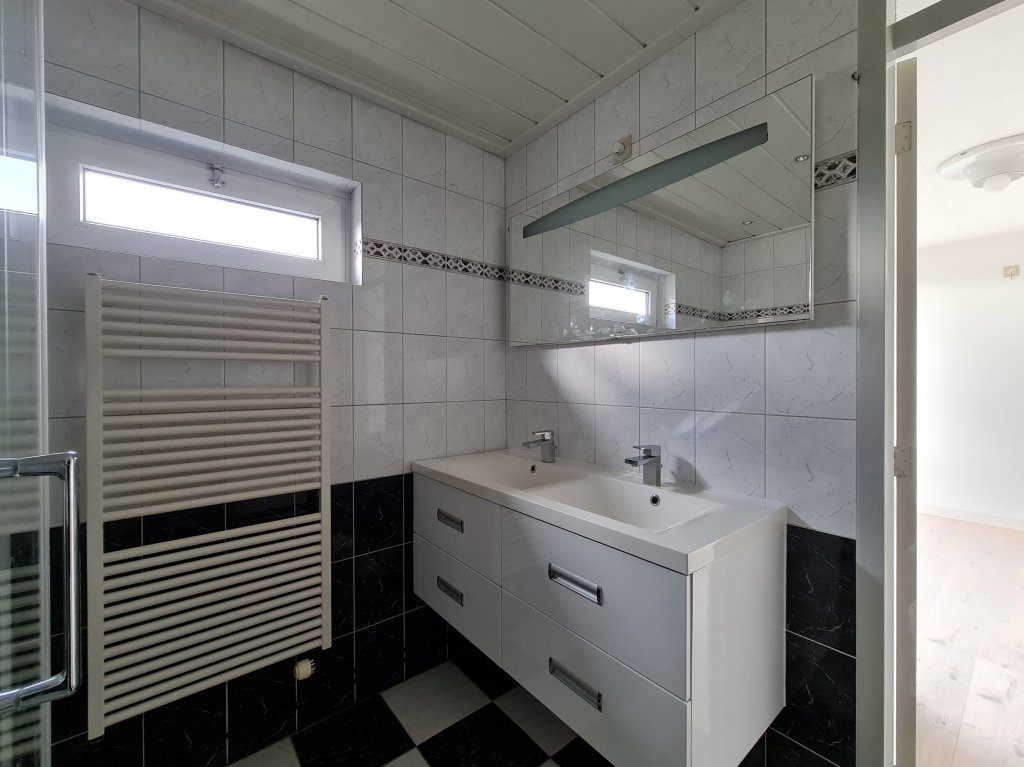 1st Floor: Landing with access to bathroom and 3 bedrooms. The largest bedroom also has access to a balcony with a beautiful view over the park in front of the house. The bathroom is tiled and equipped with a double sink with mirror, toilet and a walk-in shower.