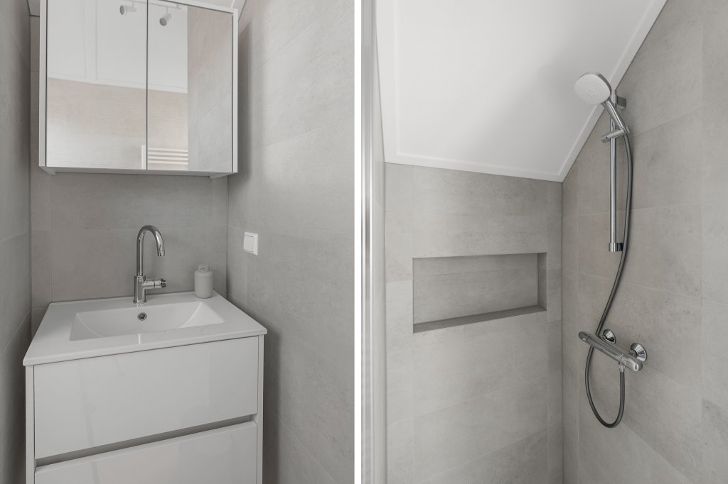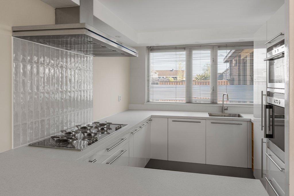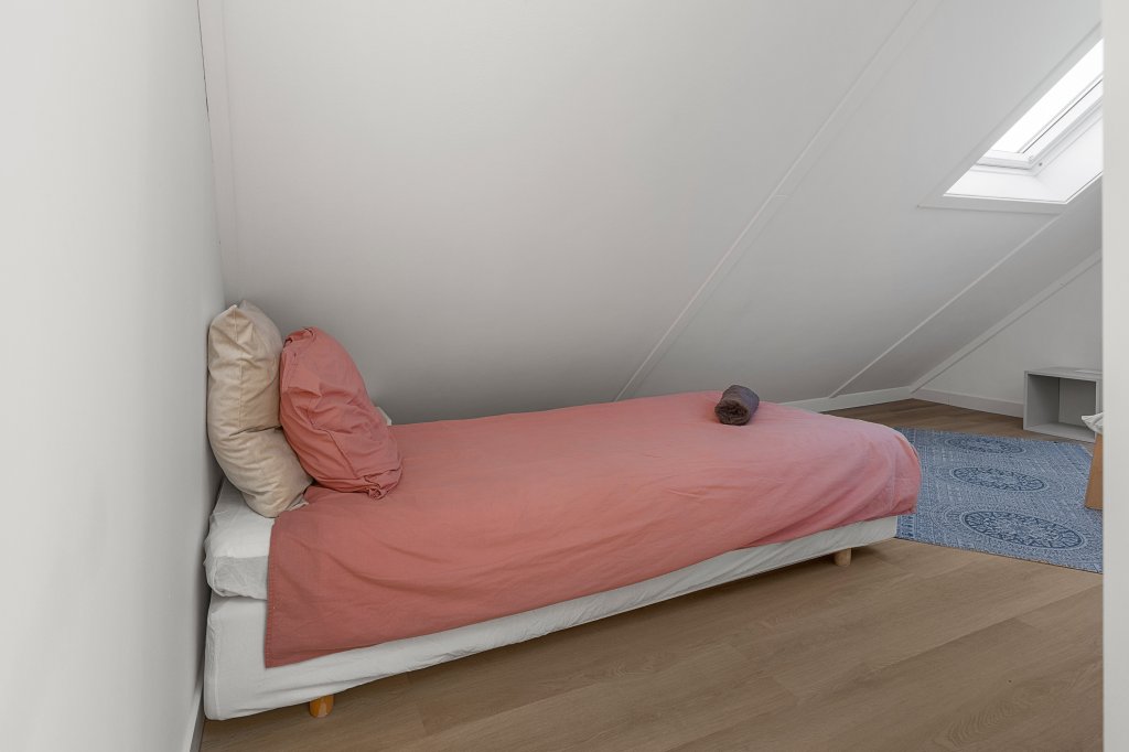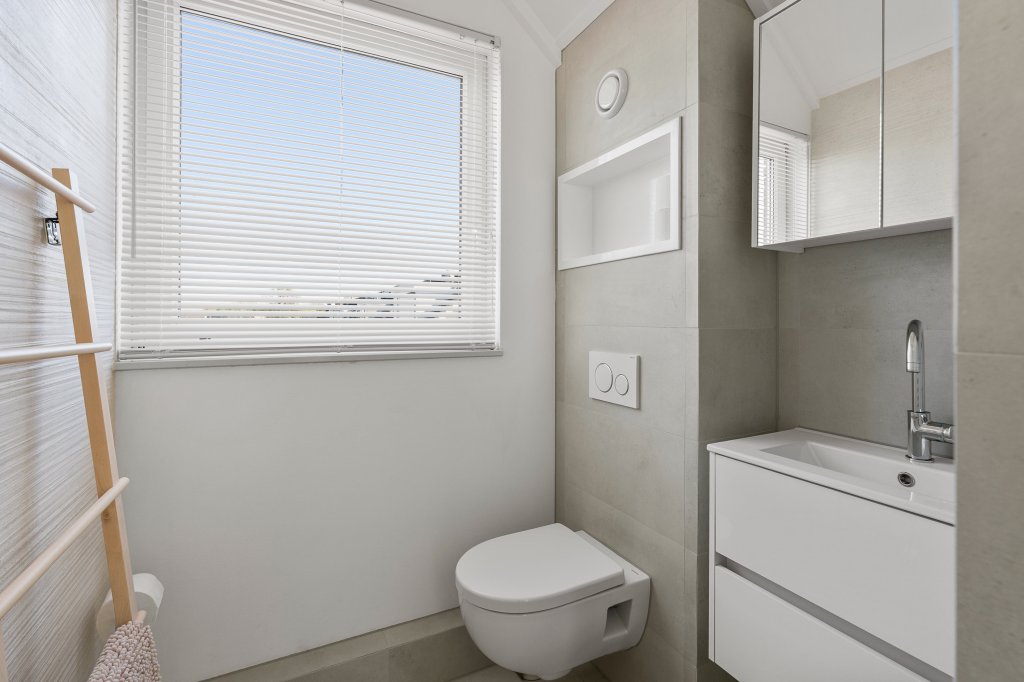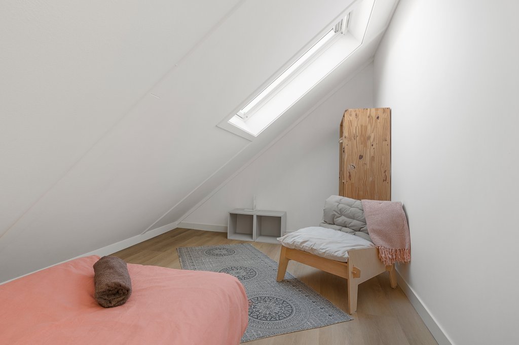 From the private parking space in front of the house, you enter a spacious hallway with access to the toilet, a large internal storage room (also accessible from the parking area and equipped with a washing machine and dryer), the staircase to the upper floors, and the very spacious living room with open-plan kitchen. Large windows at the front, skylights, and an expansive sliding door at the rear provide plenty of natural light throughout the living area. The kitchen is equipped with all modern appliances, including a designer gas hob with stainless steel extractor hood, fridge/freezer combination, dishwasher, oven, and combination microwave.