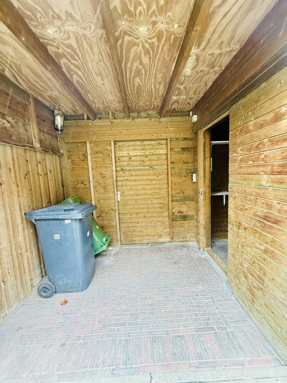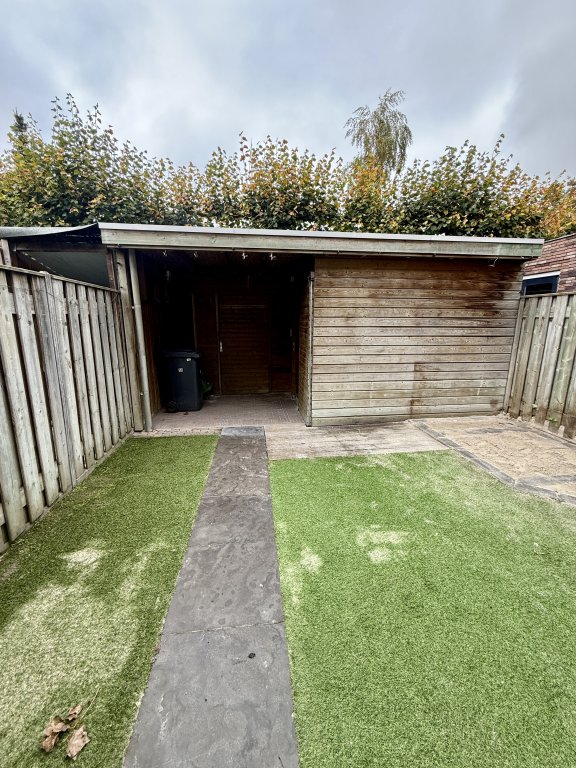 The garden is low-maintenance, neatly landscaped with artificial grass, storage shed, canopy and back entrance - ready to enjoy!