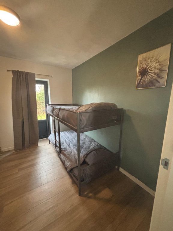 The bungalow has a practical layout and features a spacious living room with a dining area and French doors opening onto the garden. The kitchen is fully equipped, including an oven and a microwave.