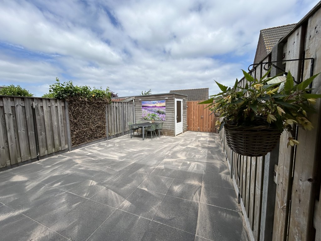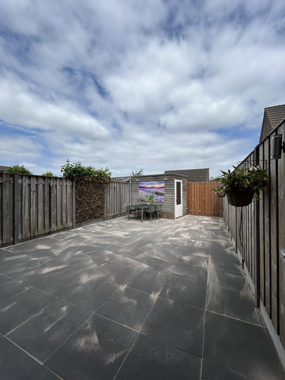 The backyard is located on the north-east. The garden is fully paved and has a wooden fence on both sides. In the garden there is also a wooden shed (approx. 6 sqm). The garden has a back.