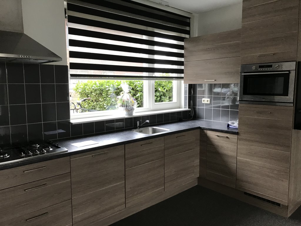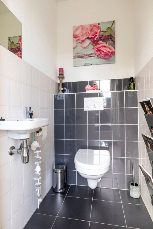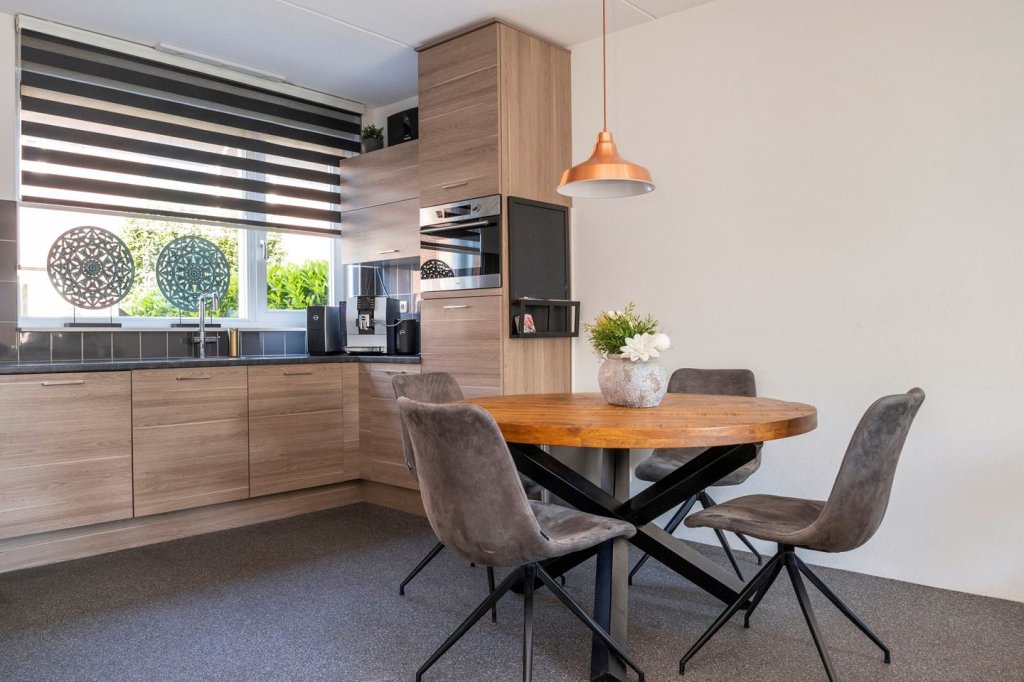 The L-shaped kitchen is finished with a plastic countertop and equipped with 4-burner stove, microwave, extractor, dishwasher and single sink. From the living room is also the rear entrance. The rear entrance gives access to the toilet and garden. The rear entrance is finished with a gravel floor with a sealing layer and spraying as a wall and ceiling finish. The toilet is equipped with underfloor heating and finished with tiles as a floor finish, partly tiles, partly sprayed as a wall finish and sprayed as a ceiling finish. The toilet has a hanging closet and a sink.