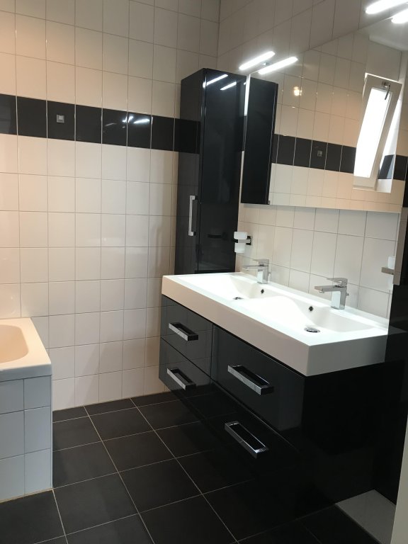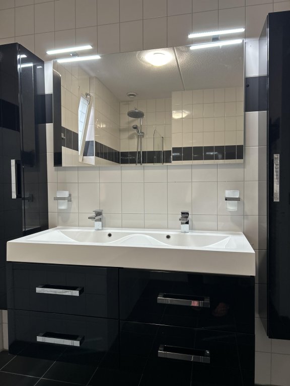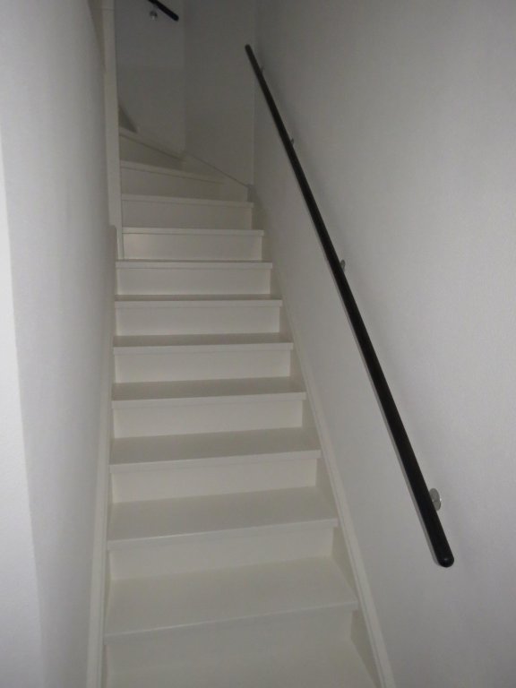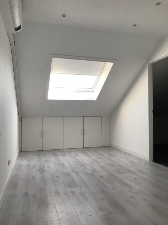 The landing is finished with a linoleum floor and painting as a wall and ceiling finish. The entire second floor is equipped with shutters. The three bedrooms are finished with a linoleum floor and painted wall and ceiling finish. One of the bedrooms 1st floor and attic room is equipped with air conditioning. The luxurious bathroom is finished with tiles as floor and wall finish and painting as ceiling finish. There is underfloor heating. The bathroom has a bath with shower, a bathroom cabinet with double sink and extra storage cupboards, a hanging closet and a radiator.