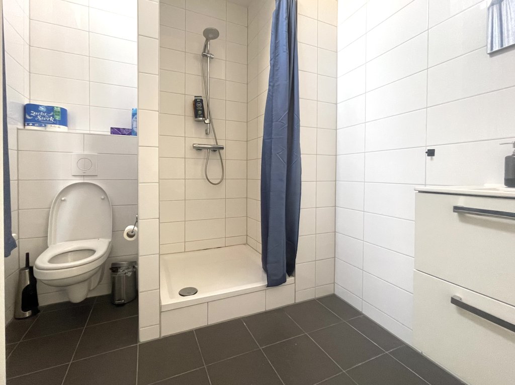 Entrance, spacious living room with high ceilings and fantastic large windows with deep window sills. Modern open kitchen with induction hob with extractor, dishwasher, combi oven and fridge with freezer compartment. Master bedroom with modern bathroom and suite equipped with sink, shower and toilet.