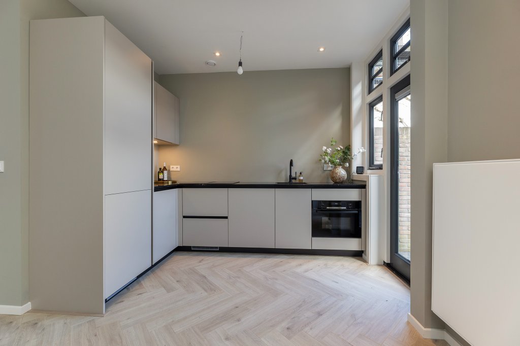 The kitchen is fully equipped with various built-in appliances, including a dishwasher, built-in fridge and freezer, combi-oven, and an induction cooktop. Through the French doors, you have direct access to the garden, creating a pleasant connection between indoor and outdoor living.