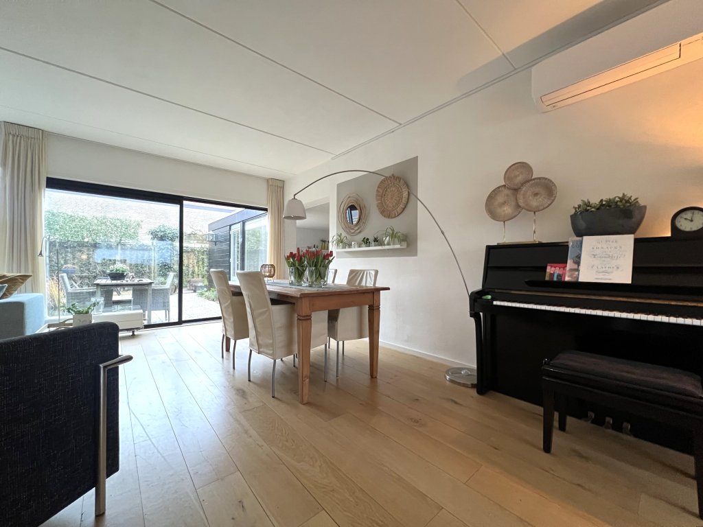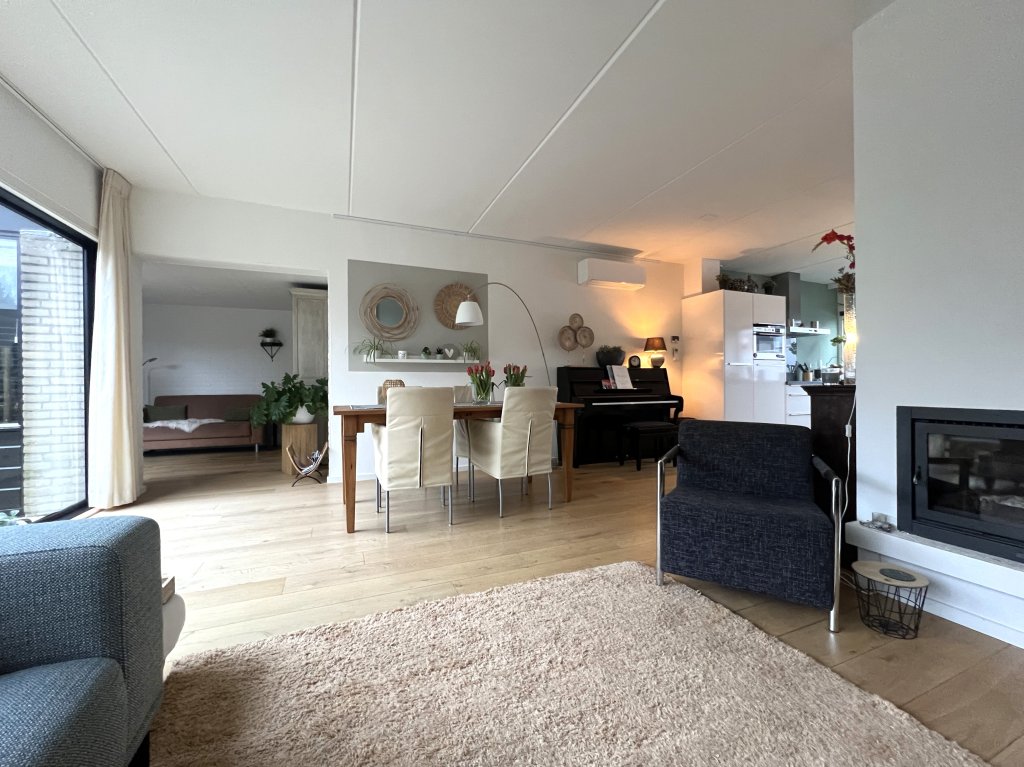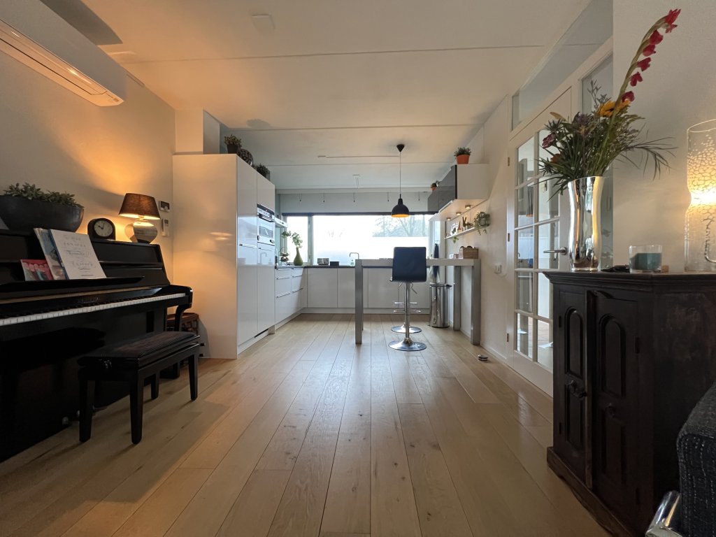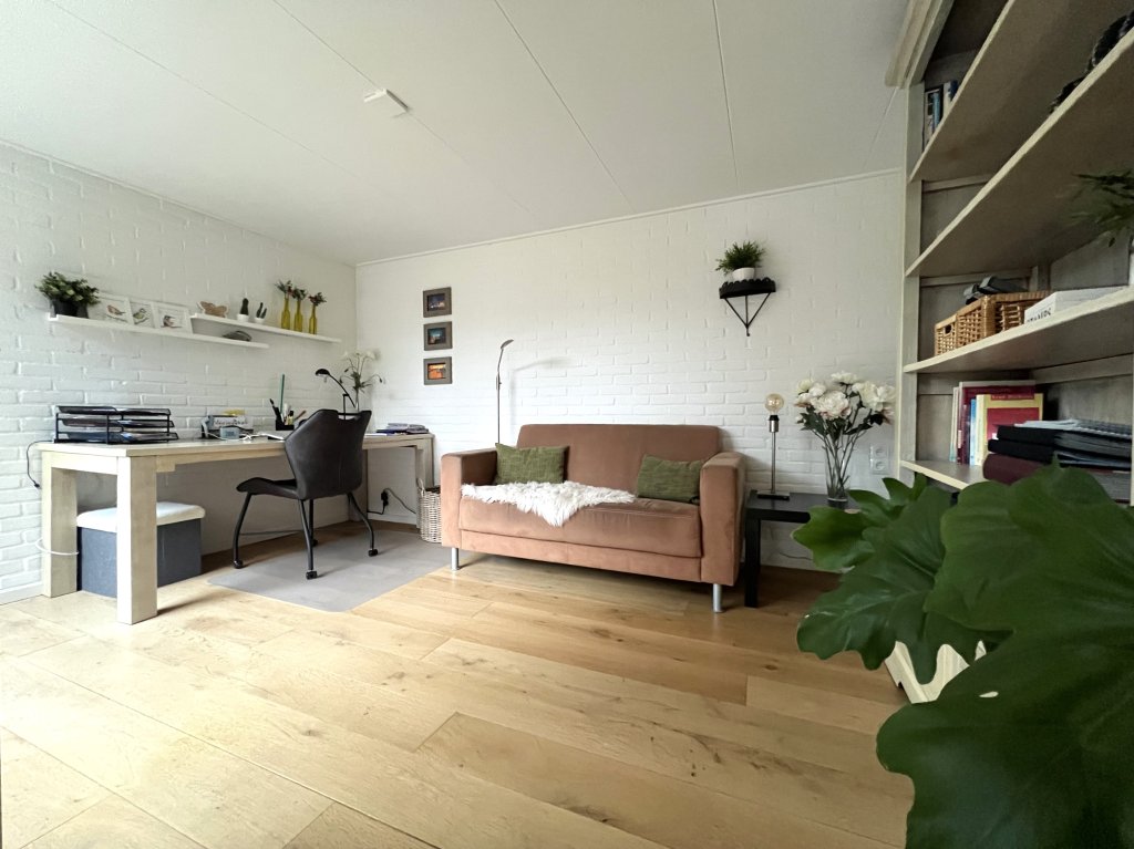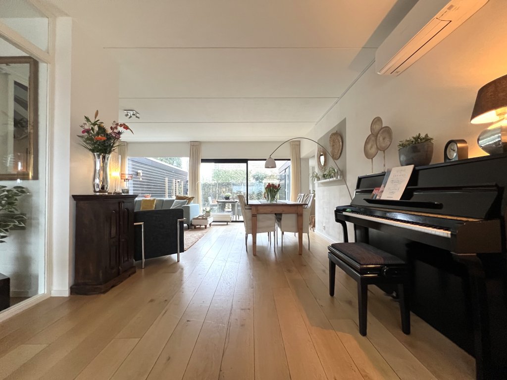 Entrance, spacious hall, toilet. Spacious, bright living room overlooking the beautiful garden. The living room has air conditioning for heating and cooling. Near the living room is a separate work/hobby room.