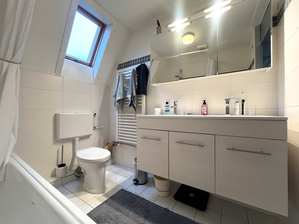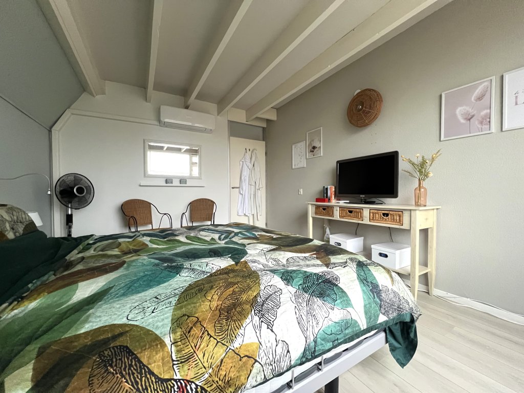On this floor are three rooms located. The rear room is used as a master bedroom and has air conditioning. The smallest has closets and space for storage. The largest (sleeping) room occupies the entire front of the house and also offers a work/study area. The neat bathroom is equipped with washbasin, bathtub with shower and toilet.