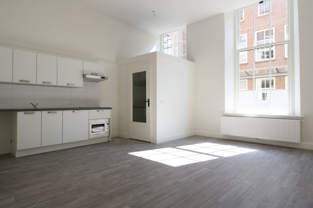 Entrance. Bright living room / bedroom with high ceilings and fantastic windows. Modern open kitchen with induction hob with extractor hood, dishwasher, combi-oven and fridge / freezer. Modern bathroom equipped with washbasin, toilet and shower.